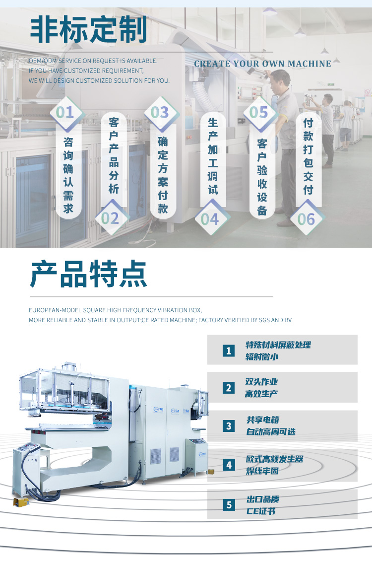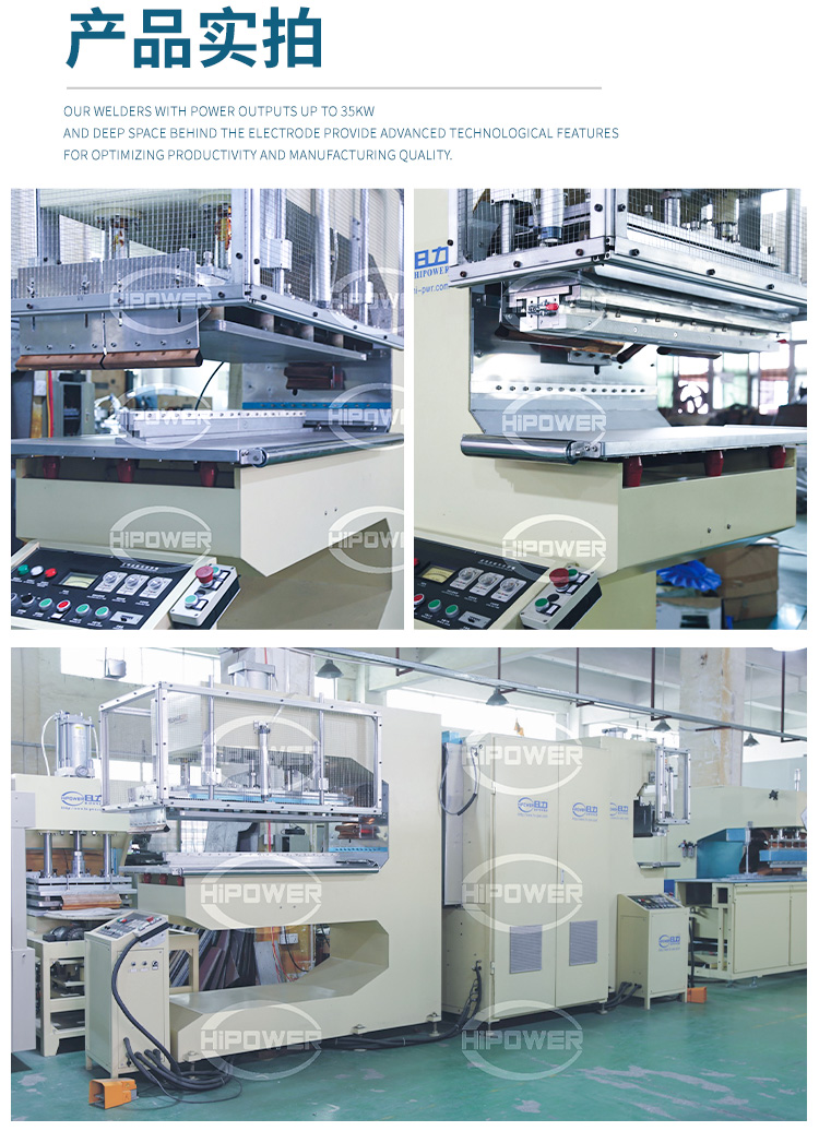 是利用機(jī)器上下極之間的高頻變化的磁場(chǎng),促使塑料件內(nèi)部分子運(yùn)動(dòng)摩擦產(chǎn)生熱量,然后借助機(jī)器壓力和配套模具作用下達(dá)到熔接定型的效果。