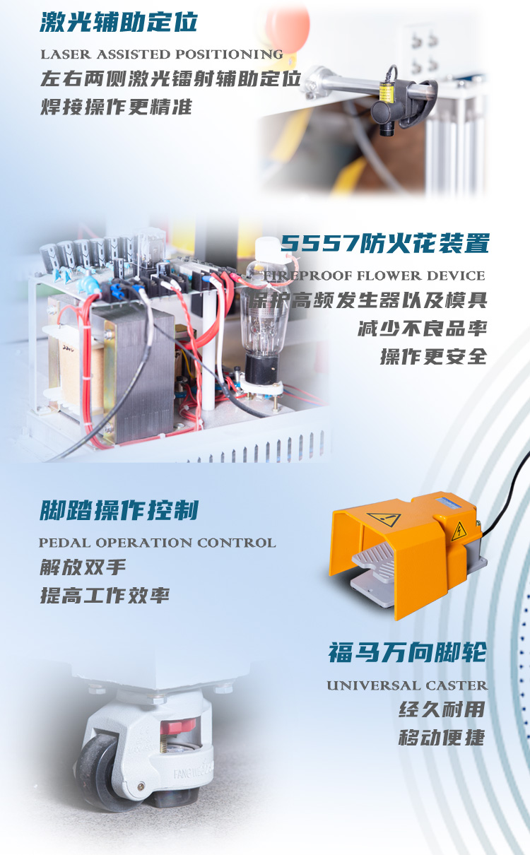 ※高頻振蕩系統為歐式方形同軸結構,高周波輸出的力量穩(wěn)定強大。高周波熔接
