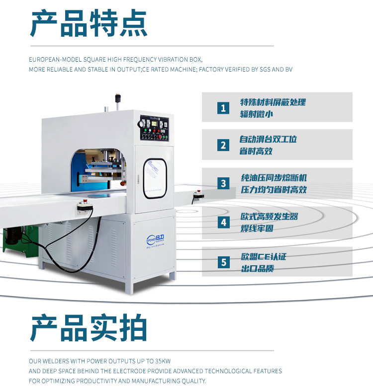 適用于APET、PETG、GAG等環(huán)保料柔軟線膠盒制作.也可用于需要高周波熔接同時(shí)又必須同步裁斷的產(chǎn)品加工.工作原理是利用高周波先熔接,再通過(guò)機(jī)器配有的壓力裝置同時(shí)切斷,基本上是同時(shí)完成.故稱(chēng)高周波同步熔斷機(jī),也稱(chēng)為高周波熔斷機(jī)、熔斷機(jī)、高周波同步裁斷機(jī)、高周波裁斷機(jī)。也可用于APET、PETG、GAG環(huán)保材質(zhì)的雙面吸塑泡殼的封口包裝、吸塑紙卡包裝、牙刷封口包裝,以EVA布類(lèi)皮革、真皮、OPP、PU材質(zhì)的熔接并熔斷。一切需熔接且同時(shí)裁切之材料,均可加工。