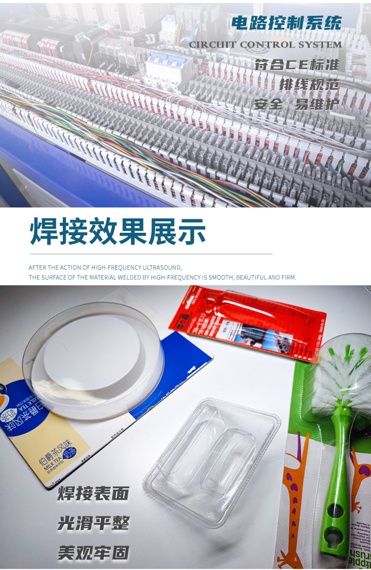 ★利用高頻熱合的原理,通過高周波模具加熱工件,到達塑料同塑料的熔接、塑膠同紙卡,或紙卡同紙卡的塑接,被熔接的紙卡通常在印刷時表面被涂上一層PVC或APET、PETG的膠水,在高周波的作用下熔為一體。高周波塑料熔接機,常用于雙面吸塑泡殼封口包裝,吸塑吊卡封口包裝,雙面紙卡夾吸塑罩熱合封口包裝,也稱為泡殼包裝,高頻熱合包裝,吸塑包裝。所以高周波吸塑包裝機,也是包裝機械,印刷包裝機械內常用的一種包裝設備。因為包裝封口后里面的產口透明易見,故而利用高周波包裝深受廠商及消費者的喜愛。機器也可用于一些塑料熔接、PVC熔接、塑膠熔接、真皮壓印等用途。
