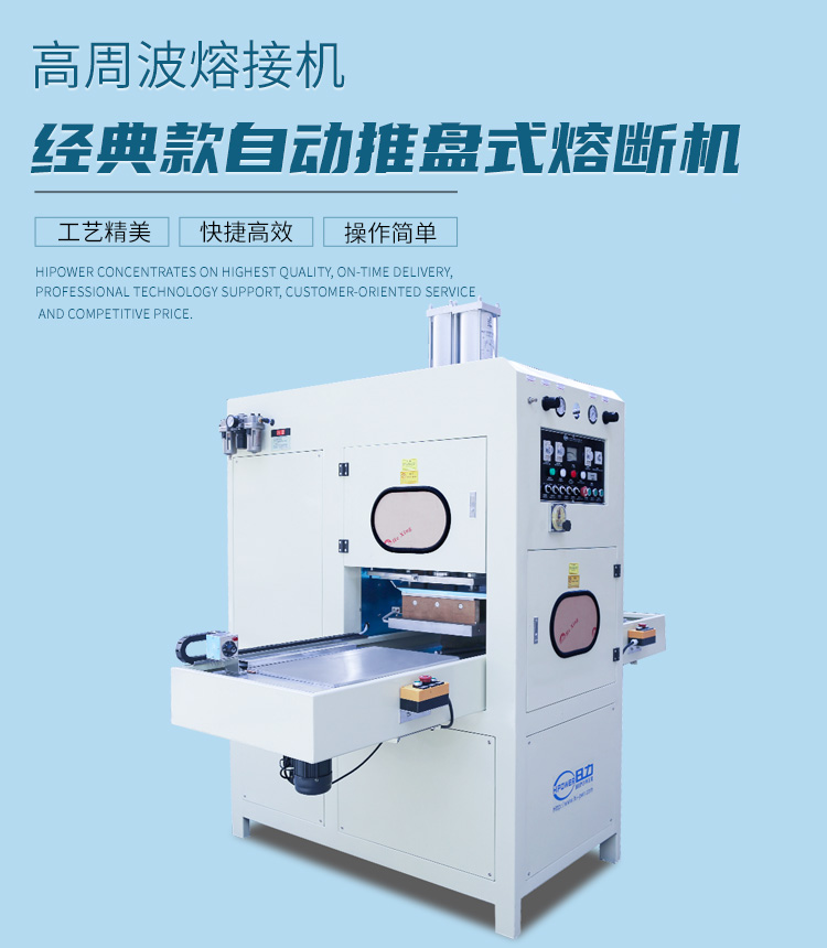 ★自動滑臺式高周波熔接機是利用高頻熱合的原理,通過高周波模具加熱工件,到達塑料同塑料的熔接、塑膠同紙卡,或紙卡同紙卡的塑接,被熔接的紙卡通常在印刷時表面被涂上一層PVC或APET、PETG的膠水,在高周波的作用下熔為一體。單頭推盤式高周波塑料熔接機,常用于雙面吸塑泡殼封口包裝,吸塑吊卡封口包裝,雙面紙卡夾吸塑罩熱合封口包裝,也稱為泡殼包裝,高頻熱合包裝,吸塑包裝。所以高周波吸塑包裝機,也是包裝機械,印刷包裝機械內常用的一種包裝設備。因為包裝封口后里面的產口透明易見,故而利用高周波包裝深受廠商及消費者的喜愛。機器也可用于一些塑料熔接、PVC熔接、塑膠熔接、真皮壓印等用途。