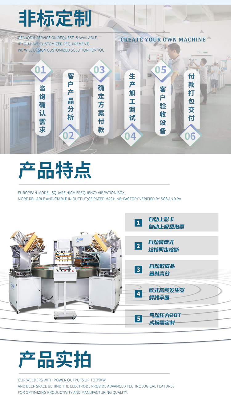 機(jī)器特點(diǎn): | 全自動(dòng)吸塑成型及高周熔接裁斷一體,自動(dòng)化高、節(jié)約人工成本 |