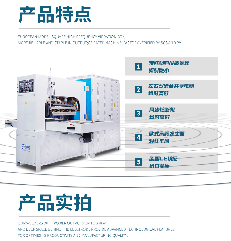 ★本高周波熔接機采用低損耗的歐洲制式同軸高頻諧振器,高周波輸出電力強大,能以迅速時間使制品熔接,大大提高了生產(chǎn)產(chǎn)量。機器設(shè)有高周波頻率穩(wěn)定器,以及高周波屏蔽裝置。將高頻干擾降低,避免電波干擾。同時可以避免由不當(dāng)操作所引起的頻率漂移,使電極和物料損壞減低同時警告燈亦發(fā)亮示警。