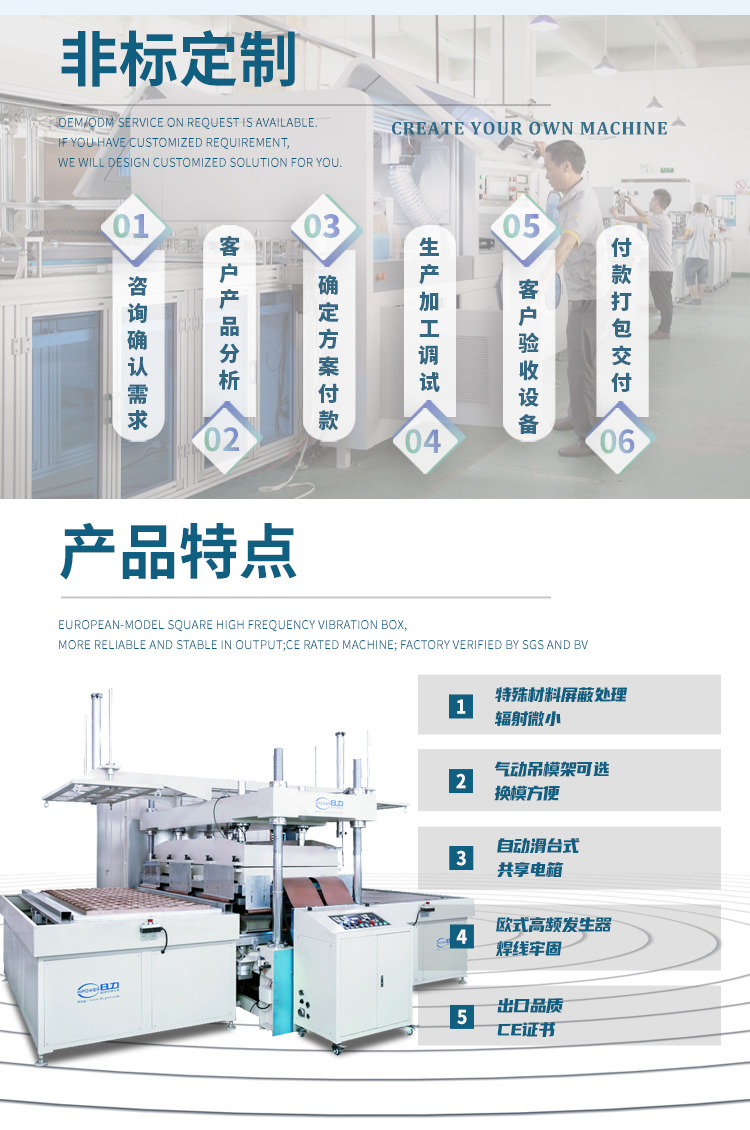 高周波水床焊接機(jī)屬于高周波設(shè)備類,它主要是由高周波電子管自激振蕩器產(chǎn)生高頻電磁場,促動有機(jī)分子流動達(dá)到相互滲透熔接的目的。高周波機(jī)的主要工作流程是把被加工對象壓在高頻電磁場的上、下電機(jī)之間,然后利用其內(nèi)部分子被激化而高速運(yùn)動自身產(chǎn)生熱量而相互流動滲透, 在模具的壓力下達(dá)到熔接或壓花的目的。主要用于PVC水床等大型產(chǎn)品的單邊焊接。 高周波水床焊接機(jī)結(jié)構(gòu)組成與特點(diǎn): 一、周率穩(wěn)定,高周波機(jī)械采用真空電子管 , 輸出功率穩(wěn)定 , 振蕩周率采用國際工業(yè)波段 27.12MHz ,符合國際標(biāo)準(zhǔn); 二、采用強(qiáng)力式機(jī)頭,壓力輕重可任意調(diào)節(jié),設(shè)計利用肘節(jié)推動杠桿原理,能使壓力均勻,上落平穩(wěn),以配合不同熔接深淺度的需要,特別適合用于難對位產(chǎn)品。 三、避免電波干擾裝置:設(shè)有高周波頻率穩(wěn)定器及高周波屏蔽裝置,將高頻干擾降低。 四、輸出力強(qiáng):采用低損耗的同軸諧振器,能使制品熔接,大大提高生產(chǎn)量。 五、過流保護(hù)系統(tǒng):自動過流保護(hù)系統(tǒng),可增加真空電子管使用壽命 , 保護(hù)模具。 六、加熱裝置:無級加熱調(diào)溫裝置 , 可依不同產(chǎn)品的生產(chǎn)需要 , 可調(diào)整溫度 , 讓工作效率更高。 七、安全保護(hù)裝置:工作中當(dāng)電流負(fù)荷超過限制值時,過荷電流繼電器會自動切斷高壓,保護(hù)振蕩管及整流器;此外,本機(jī)備有高靈敏度的火花抑制器,同時可以避免由不當(dāng)操作所引起的頻率漂移。 高周波水床焊接機(jī)的技術(shù)規(guī)格: 機(jī) 型: HR-25KW HR-35KW 高周波 功率: 25000W 35000W 電 源 電 壓: 380V 50/60Hz 頻 率: 13.56MHz 輸 入 功 率: 35KVA 50KVA 整 流 器: 矽二極體 振 蕩 器: 8T25RA 8T877RB 最 大 壓 力: 1500kg 2000kg 電 極 間 隔: 150MM 活 動 尺 寸: 150MM 上電極 尺寸: 200*2100mm 200*2500mm 下電極 尺寸: 300*2200mm 300*2600mm 熔 接 時 間: 0-10S可調(diào) 產(chǎn) 能: ㄑ2500次/8H 加壓 方 式: 氣壓驅(qū)動