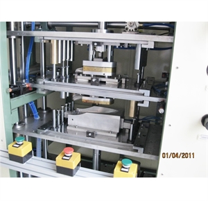 ※熱板機(jī)上壓板機(jī)構(gòu):由氣缸、直線軸承、4立柱φ30導(dǎo)桿、熱板機(jī)模具、氣動(dòng)夾緊裝置、真空吸盤等部件組成。氣缸作為動(dòng)力源,帶動(dòng)熱板機(jī)構(gòu)沿四條導(dǎo)桿上下作直線運(yùn)動(dòng)。真空系統(tǒng)采用進(jìn)口真空發(fā)生器輸出真空壓力,通過真空吸盤來將膠件牢固的吸住,確保膠件正確定位,不損壞膠件表面。