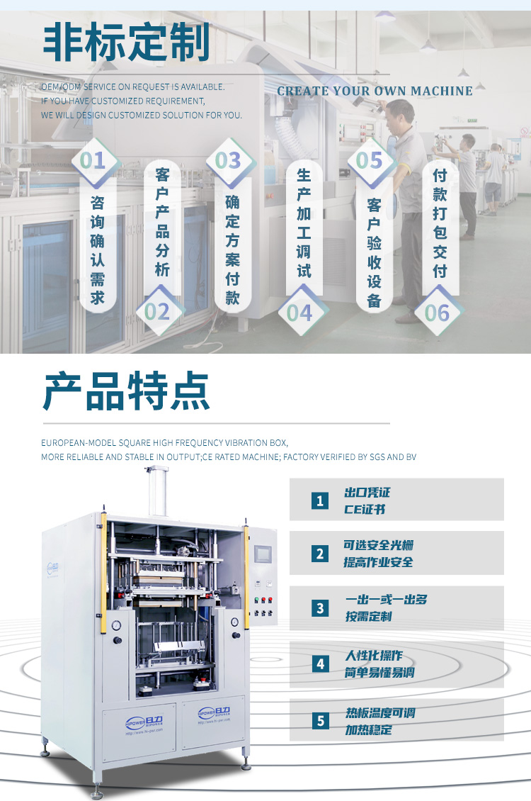 ※熱板機(jī)整機(jī)結(jié)構(gòu)特點(diǎn):采用國標(biāo)優(yōu)質(zhì)矩形鐵管焊接而成,表面再經(jīng)噴塑工藝處理。門板由數(shù)控折彎機(jī)及沖床加工成型后,表面再經(jīng)噴塑工藝處理。熱板移動(dòng)機(jī)構(gòu)由氣缸、滑塊導(dǎo)軌、熱板等部件組成。氣缸作為動(dòng)力源,帶動(dòng)熱板機(jī)構(gòu)沿兩條滑塊導(dǎo)軌前后作直線運(yùn)動(dòng)。熱板焊接機(jī)部件:由熱板模、加熱板組成,熱板模與加熱板通過快速定位緊固機(jī)構(gòu),與熱板移動(dòng)機(jī)構(gòu)連接。熱板機(jī)結(jié)構(gòu)的特點(diǎn)是:熱板在運(yùn)動(dòng)時(shí),平穩(wěn)且運(yùn)動(dòng)間隙小。熱板機(jī)構(gòu)上,帶加熱板及上、下熱模,以及加熱板固定熱模的快速聯(lián)接機(jī)構(gòu),能夠有效快速更換不同產(chǎn)品,優(yōu)化了其使用范圍、提高了生產(chǎn)效率。熱板機(jī)上、下模板通過4根限位導(dǎo)桿與熱板焊接機(jī)聯(lián)接在一起,可以精確調(diào)整焊接深度,共同組成一個(gè)設(shè)備的主要運(yùn)動(dòng)部件。