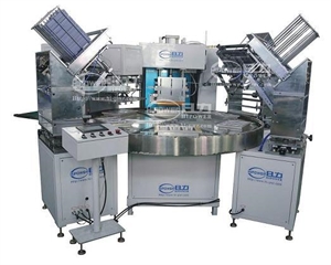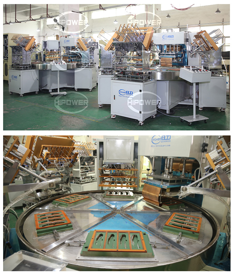 本設(shè)備是由深圳日力公司自主開發(fā)研制的一套自動(dòng)高周波吸塑包裝的熔接作業(yè)設(shè)備,本設(shè)備工序流程如下: 第1個(gè)工位底蓋吸塑機(jī)械手放入轉(zhuǎn)盤模具內(nèi)、 第2個(gè)工位由人工(或機(jī)械手)放被包裝物、 第3個(gè)工位由機(jī)械手自動(dòng)放入紙卡到模具, 第4個(gè)工位上泡殼吸塑吸塑機(jī)械手放入轉(zhuǎn)盤模具內(nèi) 第5個(gè)工位高周波進(jìn)行自動(dòng)熔接裁切處理,