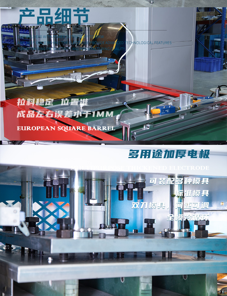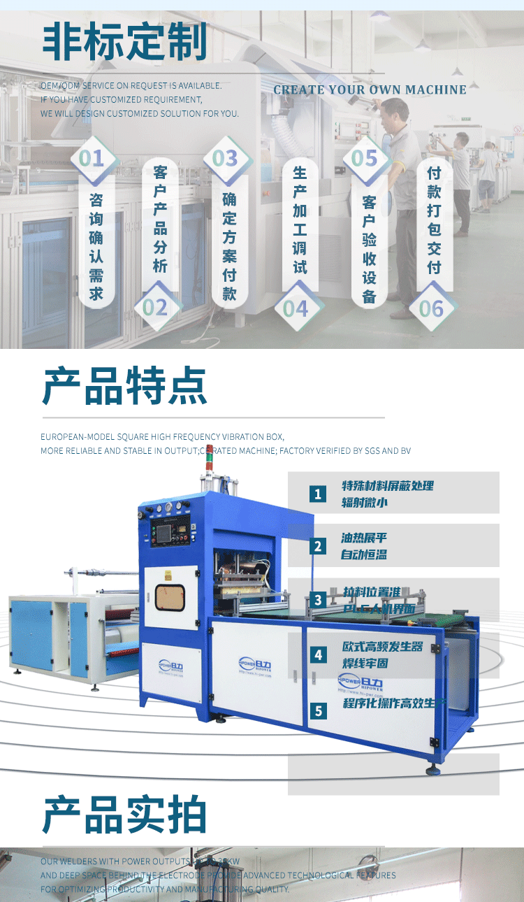 環(huán)保料高周波柔軟線膠盒機的用途: 最適用于APET、PETG、GAG等環(huán)保料柔軟線膠盒制作.也可用于需要高周波熔接同時又必須同步裁斷的產(chǎn)品加工.工作原理是利用高周波先熔接,再通過機器配有的壓力裝置同時切斷,基本上是同時完成.故稱高周波同步熔斷機,也稱為高周波熔斷機、熔斷機、高周波同步裁斷機、高周波裁斷機。也可用于APET、PETG、GAG環(huán)保材質(zhì)的雙面吸塑泡殼的封口包裝、吸塑紙卡包裝、牙刷封口包裝,以EVA布類皮革、真皮、OPP、PU材質(zhì)的熔接并熔斷。一切需熔接且同時裁切之材料,均可加工。 環(huán)保料高周波柔軟線膠盒機的特點: ■ 純油壓式壓力,出力更穩(wěn)定,左右雙向自動滑臺,往返連續(xù)推送模具,定位精準±20um。 ■ 裁斷壓力1-30噸可調(diào),出力穩(wěn)定可靠,結(jié)構(gòu)剛強。 ■ 采用高靈敏度PL5557火花防止器,有效防止損壞模具. ■ 加壓方式:純油壓式兩段壓力,無需氣源。 技術(shù)規(guī)格; 機 型 HR-15KW-30T HR-25KWP-40T 高周波 功率 15000W 25000W 電 源 電 壓 380V 50/60Hz 頻 率 13.56MHz 輸 入 功 率 25KVA 35KVA 整 流 器 SILICON DIODE 矽二極體 振 蕩 器 7T85RB 8T25RA 最 大 壓 力 30T 40T 電 極 間 隔 150MM 焊頭活動尺寸 150MM 上電極 尺寸 700*800mm 800*900mm 下電極 尺寸 700*800mm 800*900mm 溫 度 范 圍 30-200℃可調(diào)Adjustable 熔 接 時 間 0-10S可調(diào)Adjustable 產(chǎn) 能 ㄑ35000times/8H <機器相關(guān)所有尺寸,均可根據(jù)用戶要求定制。因改良需要,規(guī)格變動不另通知> |