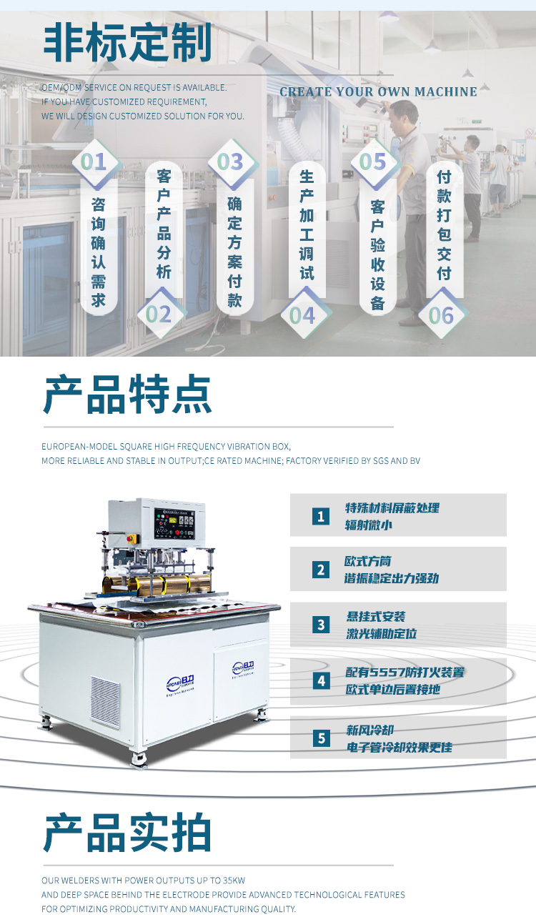 機(jī)器可連續(xù)壓線接熔,接熔長(zhǎng)度可以自由定制。歐洲制式方形高頻震蕩箱,出力更大,更加穩(wěn)定。機(jī)器為C型結(jié)構(gòu),機(jī)身