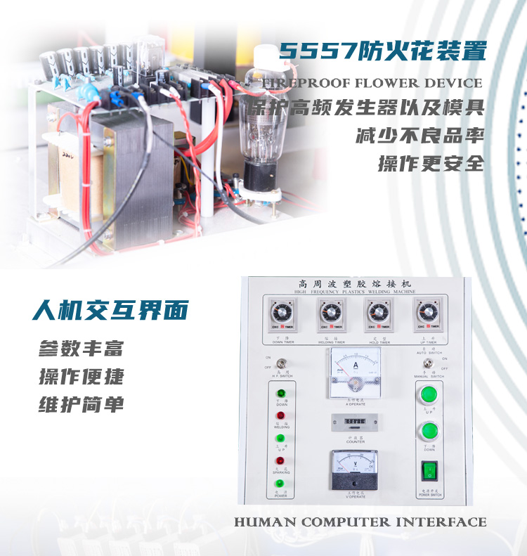 ※高頻振蕩系統(tǒng)為歐式方形同軸結(jié)構(gòu),高周波輸出的力量穩(wěn)定強(qiáng)大。高周波熔接