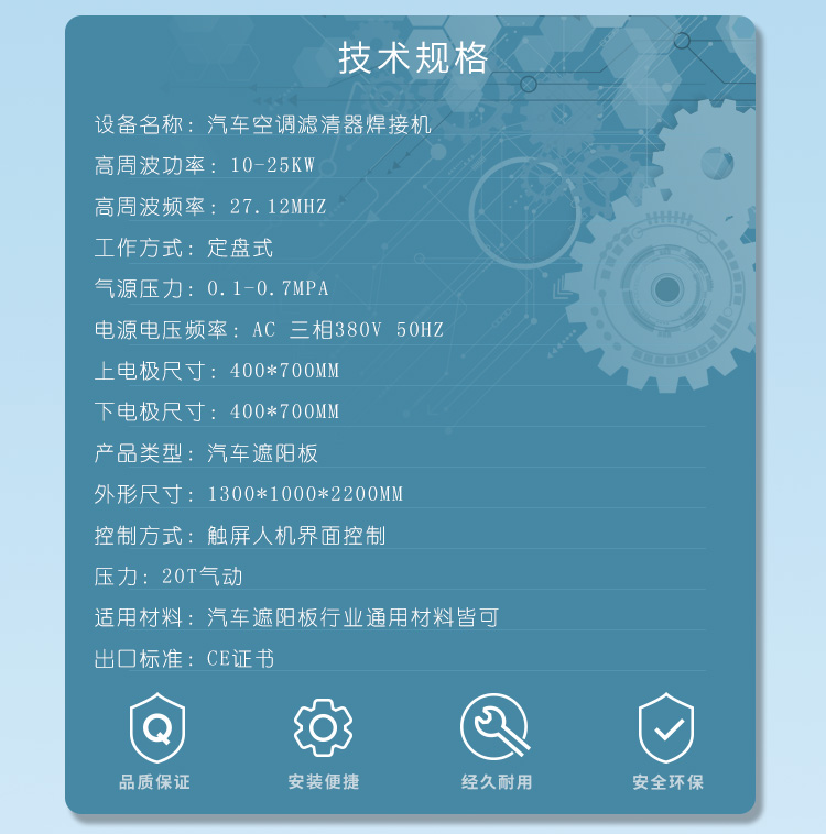 時(shí)切斷,基本上是同時(shí)完成。適用于大面積的高周波熔接裁斷,坐墊成型,大型腳墊成型,APET,PETG,GAG等環(huán)保材料的高周波柔軟線(xiàn)
