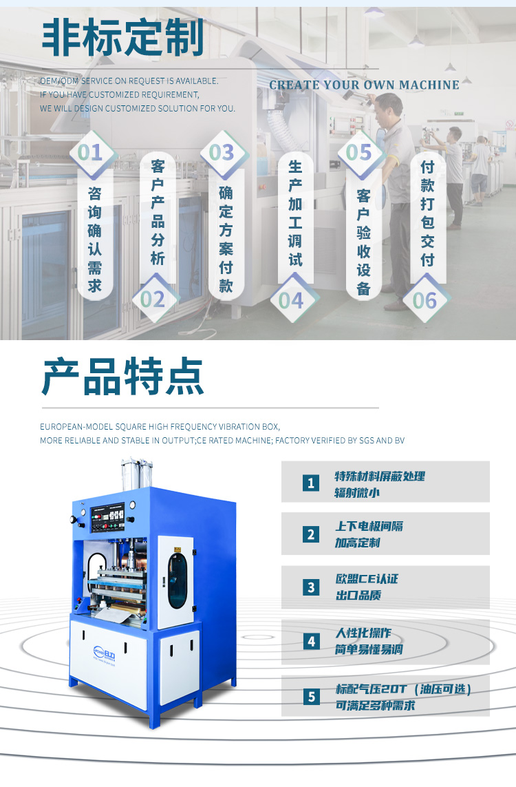 用途: 主要用于需要高周波熔接同時(shí)又必須同步裁斷的產(chǎn)品加工,高周波機(jī)的工作原理是利用高周波先熔接再通機(jī)器配有的壓力裝置同