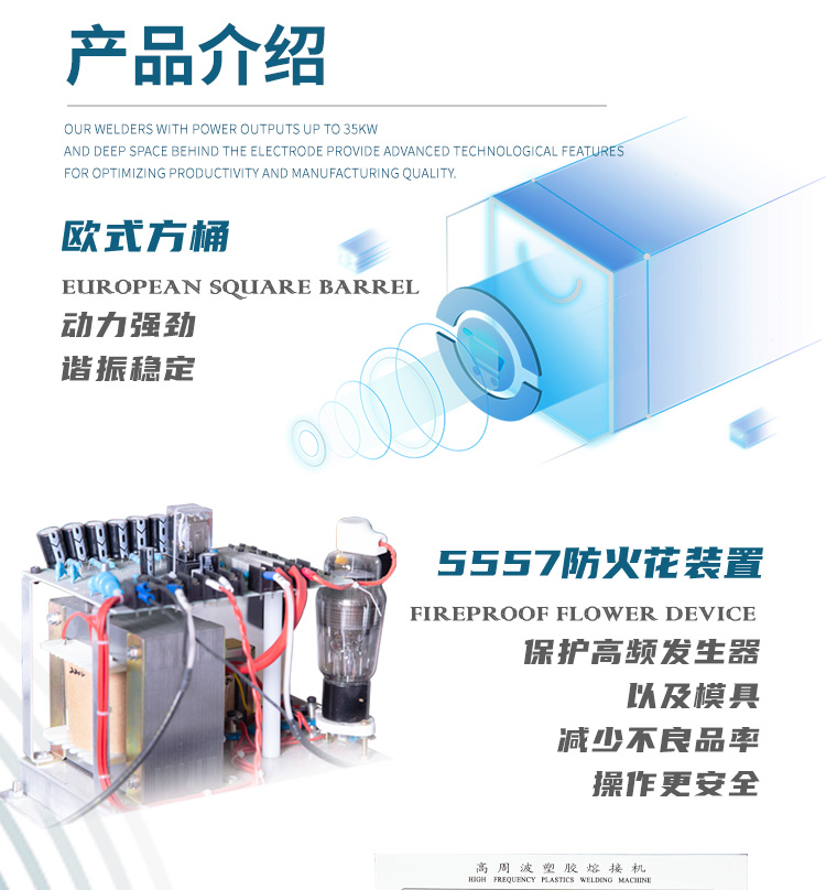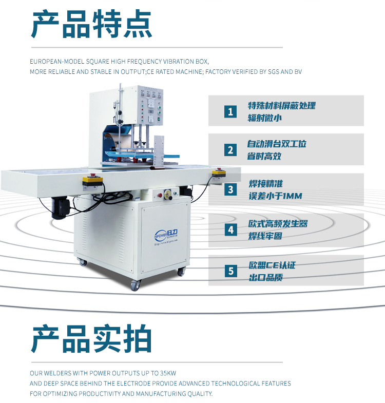 ★本高周波熔接機采用低損耗的歐洲制式同軸高頻諧振器,高周波輸出電力強大,能以迅速時間使制品熔接,大大提高了生產(chǎn)產(chǎn)量。機器設(shè)有高周波頻率穩(wěn)定器,以及高周波屏蔽裝置。將高頻干擾降低,避免電波干擾。同時可以避免由不當操作所引起的頻率漂移,使電極和物料損壞減低同時警告燈亦發(fā)亮示警。