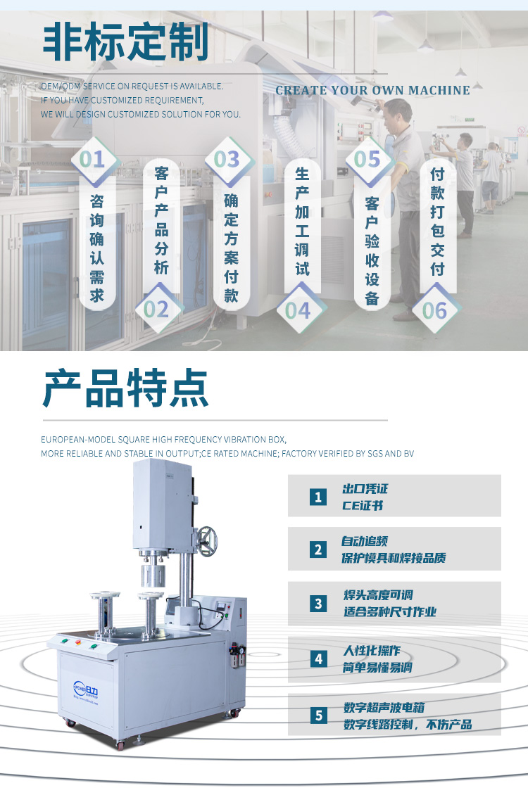 機器特點: | 2600W,最大直徑150mm,PLC 觸屏控制,自動轉(zhuǎn)盤4工位15KHZ 超音波焊接發(fā)生器,可選進口韓國/歐洲發(fā)生器 |