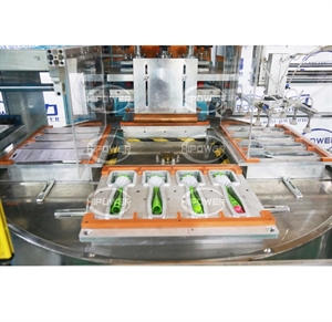 第1個工位 自動機械手,去紙卡打印日期碼,并放入轉(zhuǎn)盤模具內(nèi)、第2個工位 由操作員(或機械手)放被包裝物、