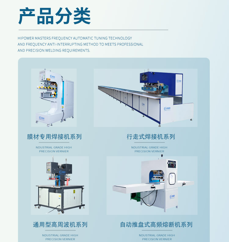 ★高周波熔斷機通常分為;自動轉(zhuǎn)盤式高周波熔斷機(可選配機械手自動取料)、自動滑臺式高周波熔斷機、手動推盤式熔斷機、雙頭式高周波熔斷機、定盤式高周波同步熔斷機等幾種。也稱為高周波熔斷機、熔斷機、高周波同步裁斷機、高周波裁斷機,本公司均有專業(yè)生產(chǎn)。本機采用低損耗的歐洲制式同軸高頻諧振器,高周波輸出電力強大,能以迅速時間使制品熔接,大大提高生產(chǎn)量。